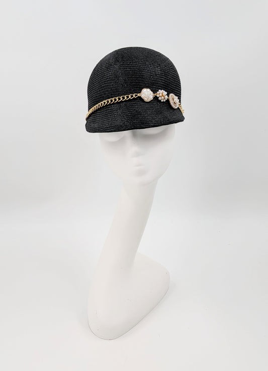 Sophisticated Black Parisisal Hat | Accented with Gold & White Quatrefoil Chain – A Timeless, Luxe Couture Statement